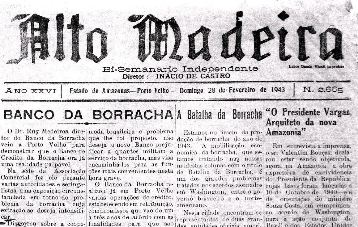 Porto Velho ainda pertencia ao Amazonas no final de fevereiro de 1943, quando o diretor do Banco de Crédito da Amazônia), Ruy Medeiros, visitava a Associação Comercial de Porto Velho, lotada de seringalistas. Ali, ele expôs o plano de ampliação da extração do látex. E assim, o chamado Banco da Borracha realizou várias operações de crédito. Atualmente, o Governo de Rondônia dá especial atenção às Câmaras de Carne, Café, Leite, Soja, mas se omite em relação ao látex que protagonizou um ciclo econômico no extinto Território Federal do Guaporé.