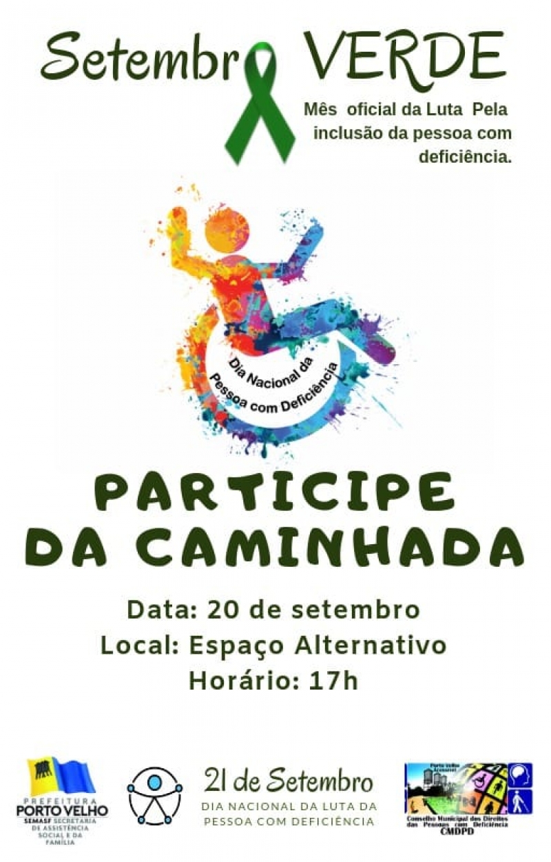 O Conselho Municipal dos Direitos da Pessoa com Deficiência (CMDPD), convida toda população de Porto Velho para participar da caminhada do Dia Nacional da Luta da Pessoa com Deficiência que vai ser realizada nesta sexta-feira (20), às 17 horas, no Espaço Alternativo.