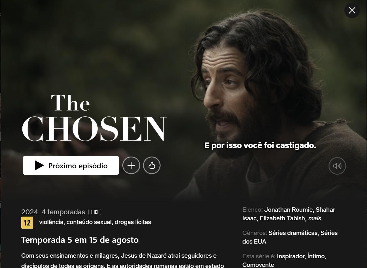 Alguns meses após ter sido exibida nos cinemas no Brasil através de sessões especiais, agora The Chosen 5ª temporada segue em destaque enquanto está também sendo laçada nos streamings como Netflix e Amazon Prime Video.