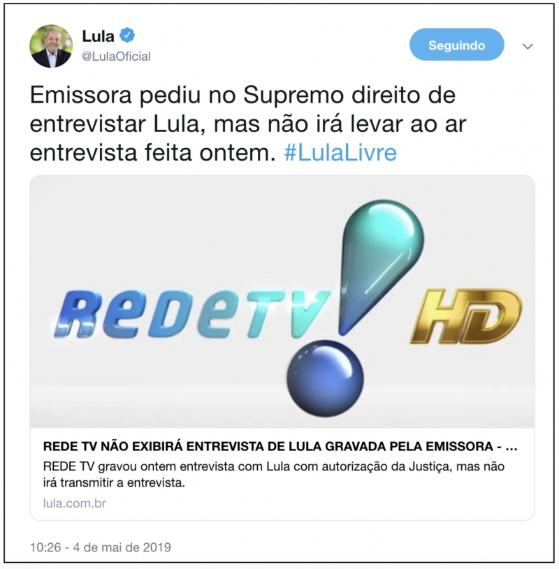 A emissora RedeTV! desistiu de exibir a entrevista gravada nesta 6ª (3.mai.2019) com o ex-presidente Luiz Inácio Lula da Silva. A publicação estava prevista para a noite deste sábado (4.mai.2019).