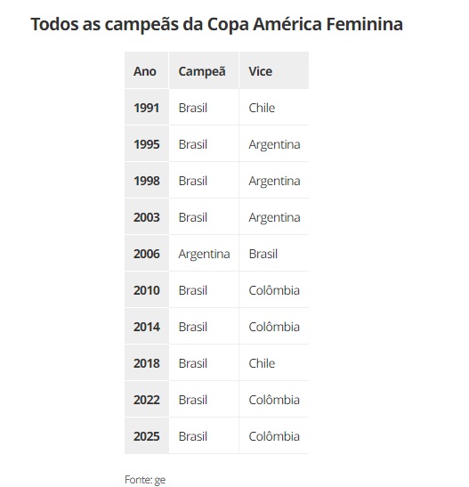 A Copa América Feminina conheceu o seu campeão da 2025: o Brasil. A Seleção é a maior campeã do torneio, conquistando nove títulos em dez disputados. Apenas a seleção argentina conseguiu acabar com a hegemonia brasileira.