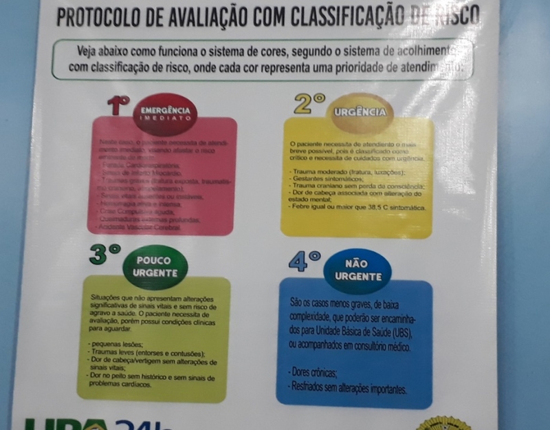 Dão a pulseira vermelha para os casos que consideram emergência, amarela para os de urgência, verde para os pouco urgente e azul para os não urgente. Se o paciente está com o verde, o vermelho e o amarelo serão atendidos primeiro. Se chegar a vez e, antes que chamem, surgir um caso amarelo, este vai ser atendido na frente. Se surgir outro, mais outro e mais um, o verde vai ficando para trás.