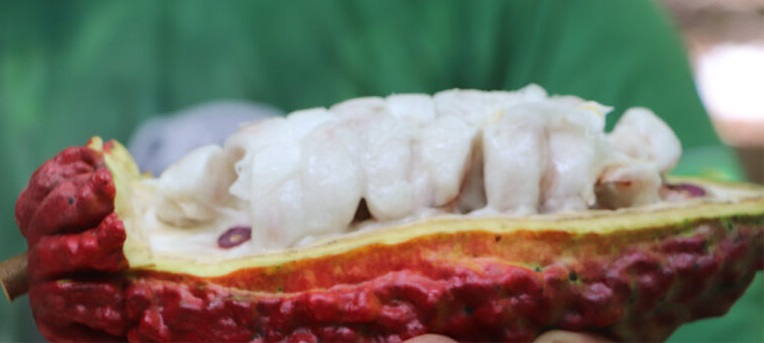 Corte de fruto de cacau expondo amêndoa no ponto ideal de colheita
