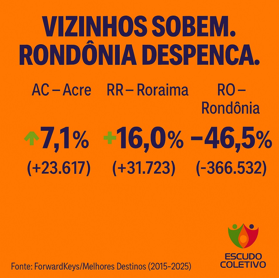 A partir das tabelas do estudo, o Instituto de Defesa da Coletividade Escudo Coletivo analisou os dados e apresentou comparações. O contraste é claro: Rondônia registrou a pior queda do Brasil em voos e assentos. Na oferta de assentos, Alagoas, São Paulo, Pernambuco, Paraíba, Acre, Roraima e outros avançaram, mas Rondônia andou para trás — a distância entre AL (+47,4%) e RO (−46,5%) é um abismo de 94 pontos percentuais. No estado vizinho, Acre, os assentos subiram 23.617 no período, saltando 7,1%. Também na Região Norte, Roraima teve incremento de 16% de assentos no mesmo período.