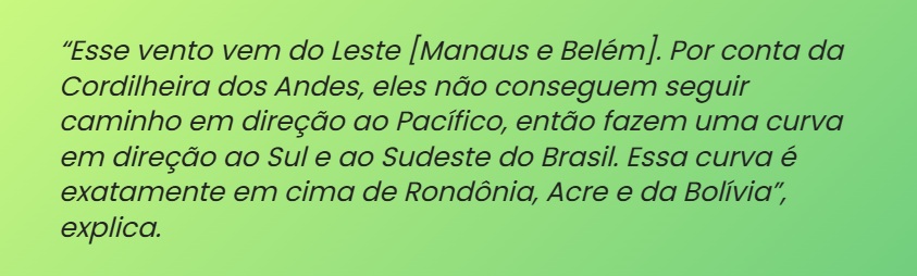 De acordo com Gobo, a posição geográfica do estado faz dele uma espécie de “esteira rolante de umidade”. O vapor d’água que evapora da floresta e do oceano é empurrado pelos ventos entre os Andes e o Planalto Brasileiro, ganhando velocidade e seguindo em direção ao centro-sul do continente.