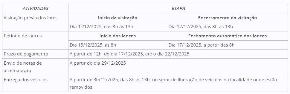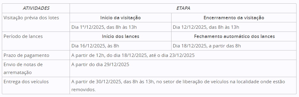 Para o Edital Nº 114/2025, ao total serão leiloados 290 veículos removidos no pátio das Circunscrições Regionais de Trânsito (Ciretrans) de Porto Velho, Itapuã do Oeste, Candeias do Jamari, Nova Mamoré, Guajará-Mirim, e Postos Avançados de Jaci-Paraná, União Bandeirantes, Triunfo, Vista Alegre do Abunã, Extrema e Nova Dimensão. Este certame, será realizado nos dias e horários, conforme cronograma abaixo: