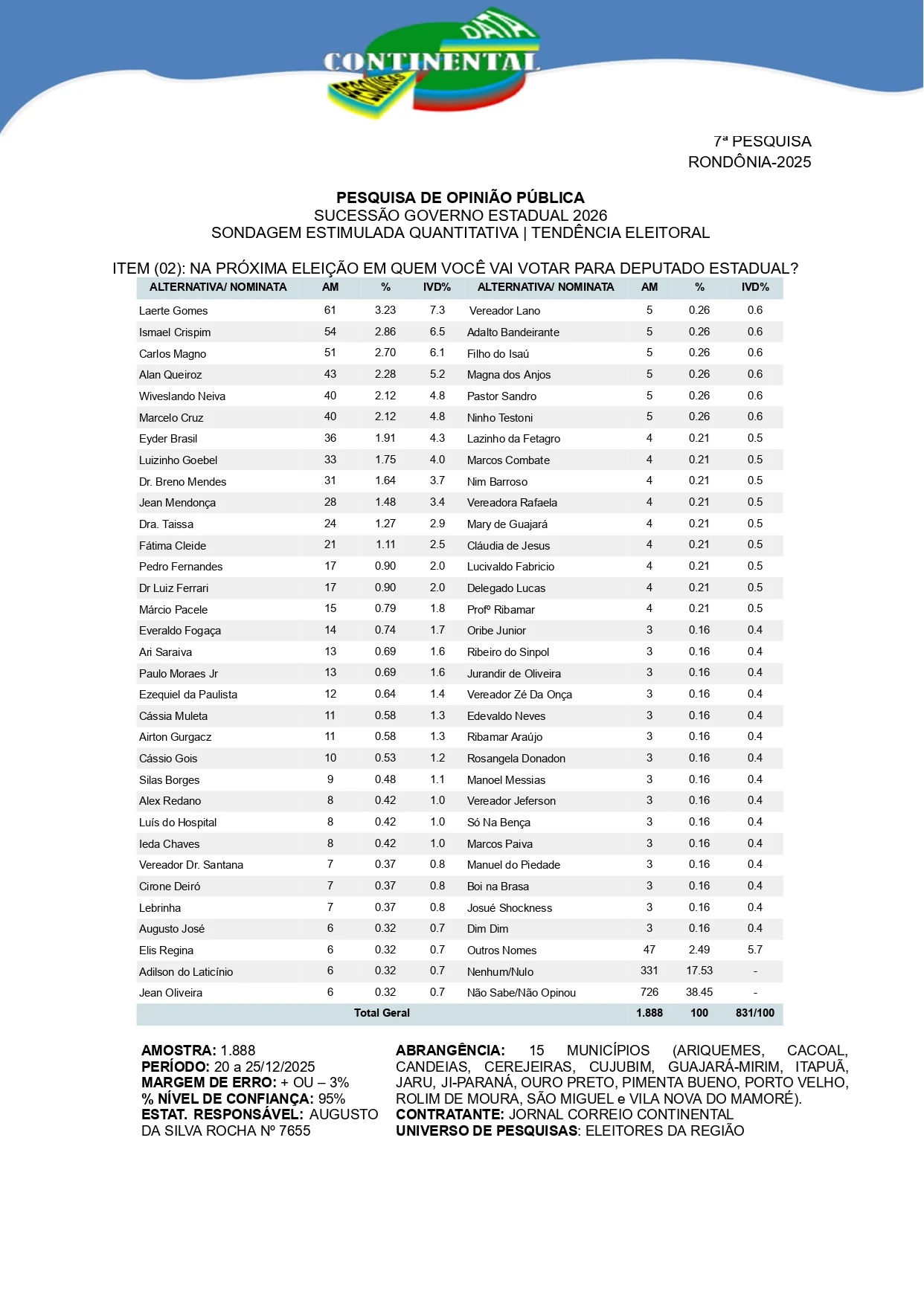 Porto Velho, RO - Pesquisa de opinião pública realizada entre os dias 20 e 25 de dezembro de 2025 revela o cenário inicial da sucessão para a Assembleia Legislativa de Rondônia (ALE) nas eleições de 2026. O levantamento, do tipo sondagem estimulada quantitativa, foi encomendado pelo Jornal Correio Continental e ouviu 1.888 eleitores em 15 municípios do estado.