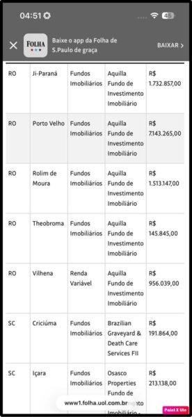 Os dados apresentados pelo site paulista, do qual a reportagem do Extra de Rondônia teve acesso, indicam investimentos registrados em cinco cidades rondonienses, com predominância do Aquilla Fundo de Investimento Imobiliário, um dos fundos mencionados nas apurações envolvendo o Banco Master.
