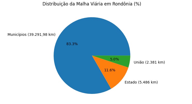 O levantamento técnico evidencia que Rondônia possui 2.381 km de rodovias federais, com aproximadamente 97% pavimentadas, 5.486 km de rodovias estaduais, sendo cerca de 70% não pavimentadas, e 39.294 km de estradas vicinais sob responsabilidade dos 52 municípios — todas não pavimentadas —, o que representa mais de 83% da malha viária em todo o Estado.