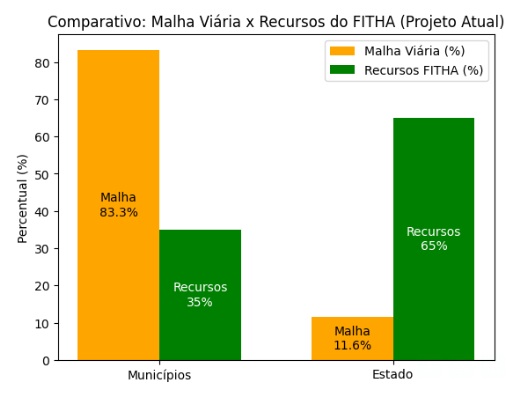 No conjunto de propostas encaminhadas ao Parlamento estadual, a AROM defende a divisão igualitária de 100% dos recursos arrecadados pelo FITHA entre Estado e municípios, fixando 50% para cada ente. Atualmente, o Projeto de Lei estabelece que até 35% da receita arrecadada seja destinada obrigatoriamente aos municípios. A contraproposta da entidade amplia essa participação, sob o argumento de que a maior parte da malha viária não pavimentada está sob responsabilidade municipal. A medida busca promover maior equilíbrio federativo e compatibilizar os repasses com a realidade operacional das prefeituras, ampliando a capacidade de investimento na manutenção e recuperação das estradas vicinais.