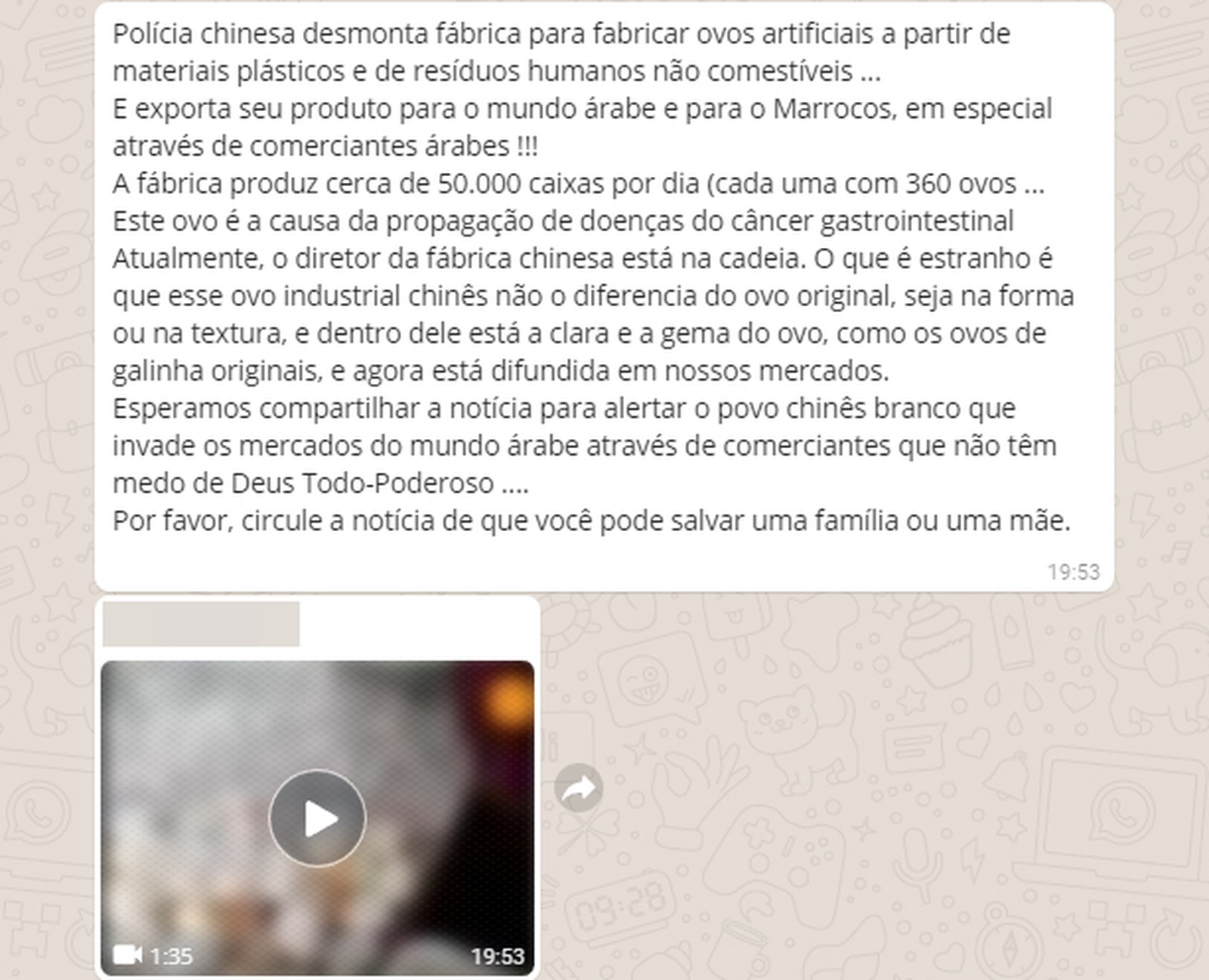 Ao menos desde 2017, outro vídeo que diz mostrar como são feitos os ovos falsos na China também circula pelas redes. Nas imagens, é possível ver mulheres colocando uma substância viscosa em um molde no formado de um ovo. As imagens foram compartilhadas recentemente em grupos do WhatsApp com o texto "Polícia chinesa desmonta fábrica para fabricar ovos artificiais a partir de materiais plásticos e de resíduos humanos não comestíveis". A informação, porém, é falsa.