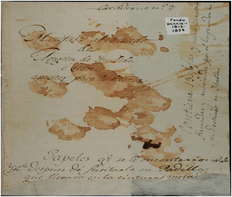 Direito de imagem World Digital LibraryImagecaption Documento "Declaração ao Mundo" ou "Notas para a História" foi encontrado junto ao corpo de Agustín de Iturbide após sua execução; sangue sobre papel é do próprio Agustín.