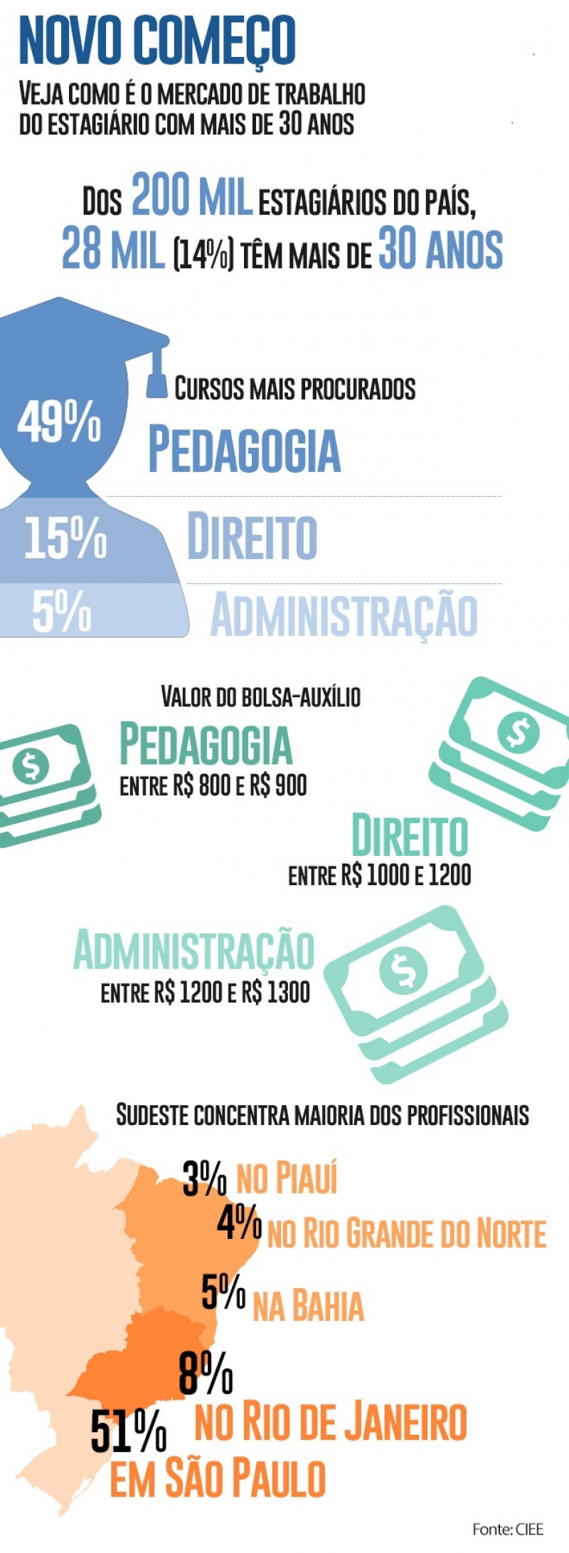 A história de Mauro não é um caso isolado no mundo dos estágios. Segundo dados do CIEE (Centro de Integração Empresa-Escola), dos 200 mil estagiários com contratos administrados por ele em todo o país, cerca de 14% (28 mil) têm acima de 30 anos.
