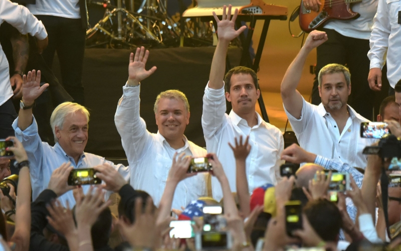 No final de janeiro, Tribunal Supremo da Venezuela determinou que o autoproclamado presidente estava proibido de deixar o país. Ele assiste ao Venezuela Aid Live ao lado dos presidentes de Colômbia, Chile e Paraguai e do secretário geral da OEA.