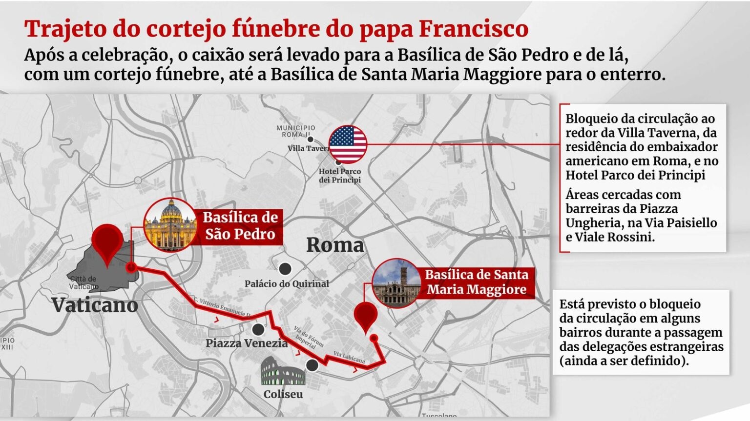 Por volta das 7h20 do horário de Brasília, teve início o cortejo fúnebre do papa Francisco pelas ruas do Vaticano. Em seguida, o caixão com o corpo do pontífice saiu da Basílica de São Pedro, rumo à de Santa Maria Maggiore, para ser enterrado em local de acesso público, conforme solicitado pelo próprio líder religioso.