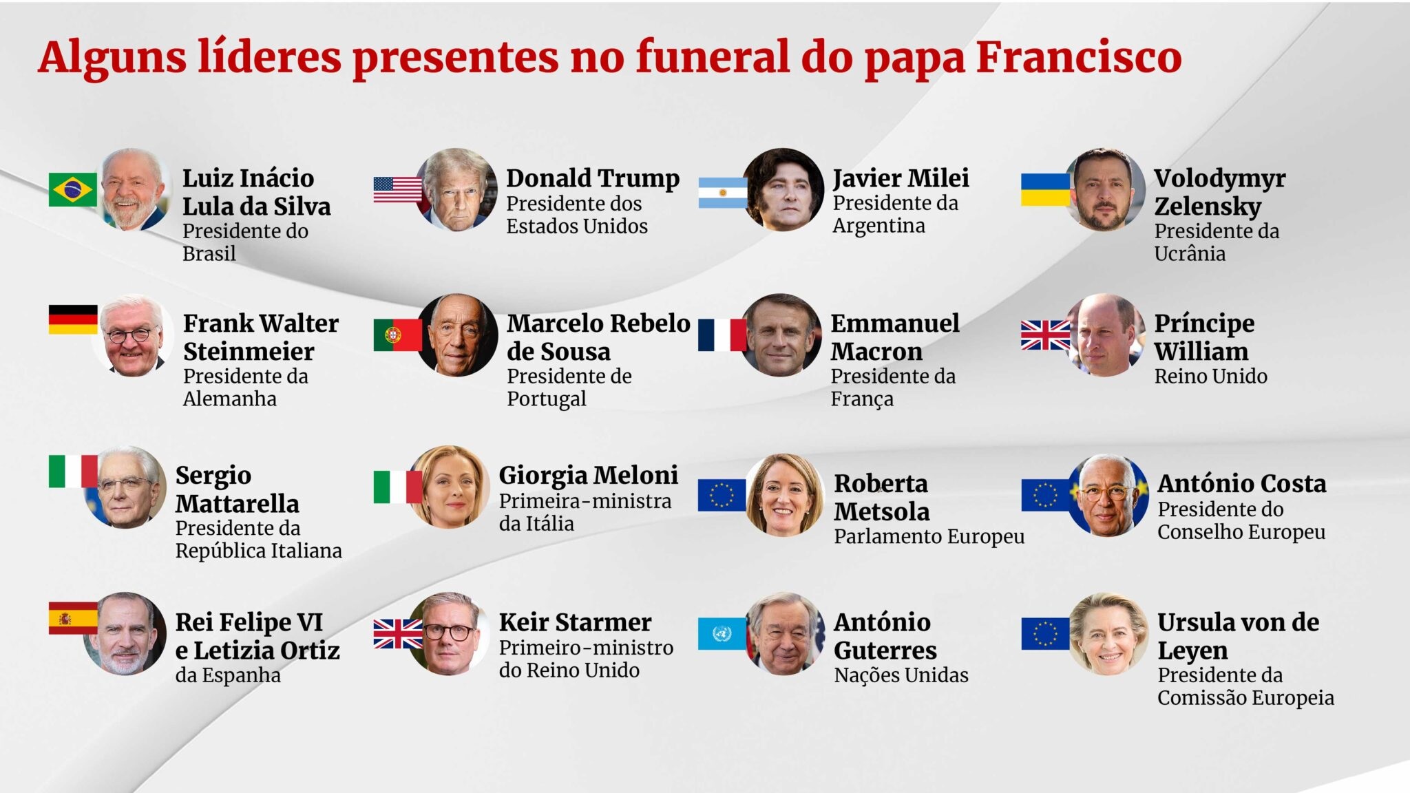 O Vaticano confirmou a participação de 130 delegações oficiais, inclusive de 50 chefes de Estado e 10 integrantes da realeza. Entre os presentes estão o presidente da Argentina, Javier Milei, e o presidente do Brasil, Luiz Inácio Lula da Silva (PT), que embarcou para Roma na quinta-feira (24/4), acompanhado de representantes dos Três Poderes.