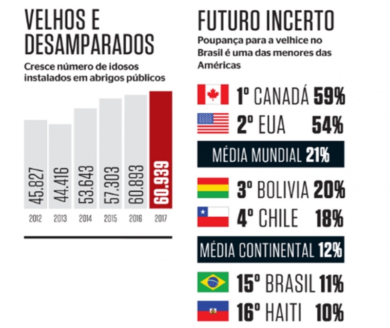 As estatísticas mostram que o brasileiro se prepara mal para enfrentar o momento em que sua a sua força produtiva se esgota. Mesmo sem poder contar com um Estado que garanta um bem-estar aos idosos, a imensa maioria da população não pensa no futuro de maneira pragmática. Um levantamento feito pelo Banco Mundial revela que a formação de uma poupança privada no Brasil para sustentar os idosos do futuro também deixa a desejar. Em um ranking de mais de 144 países, o Brasil ocupa um modesto 101° em reserva de aposentadoria, atrás de várias nações latino-americanas e muito abaixo de países desenvolvidos, como o Canadá e os Estados Unidos. Em 2017, apenas 11% dos brasileiros declararam poupar para a velhice. No Canadá esse percentual é de 59%. “Não é só um problema da pobreza”, diz Kalache. “O brasileiro não tem educação financeira. É a falta de precaução”. A falsa ideia de que o Brasil é um País de jovens está revelando uma realidade preocupante. Há um déficit na percepção de que é preciso fazer um esforço para ter uma renda confortável para um futuro cada vez mais longo. Sem isso, ter uma velhice digna será privilégio de uma minoria de brasileiros.
