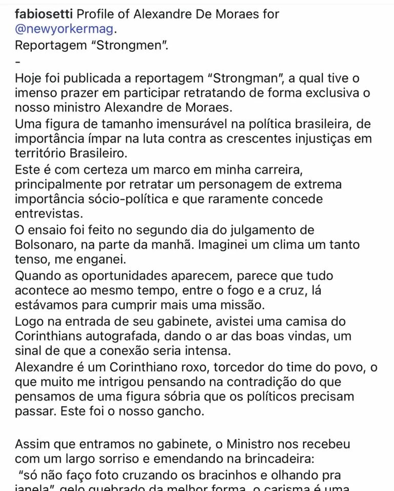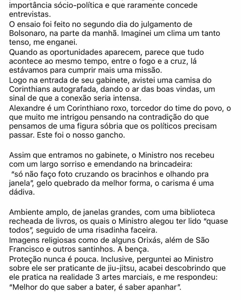 O profissional disse ainda que imaginou que o clima do trabalho seria tenso por causa do julgamento do líder da direita, mas Moraes o recebeu com um sorriso e fez brincadeiras sobre as poses que ele não faria para o ensaio.