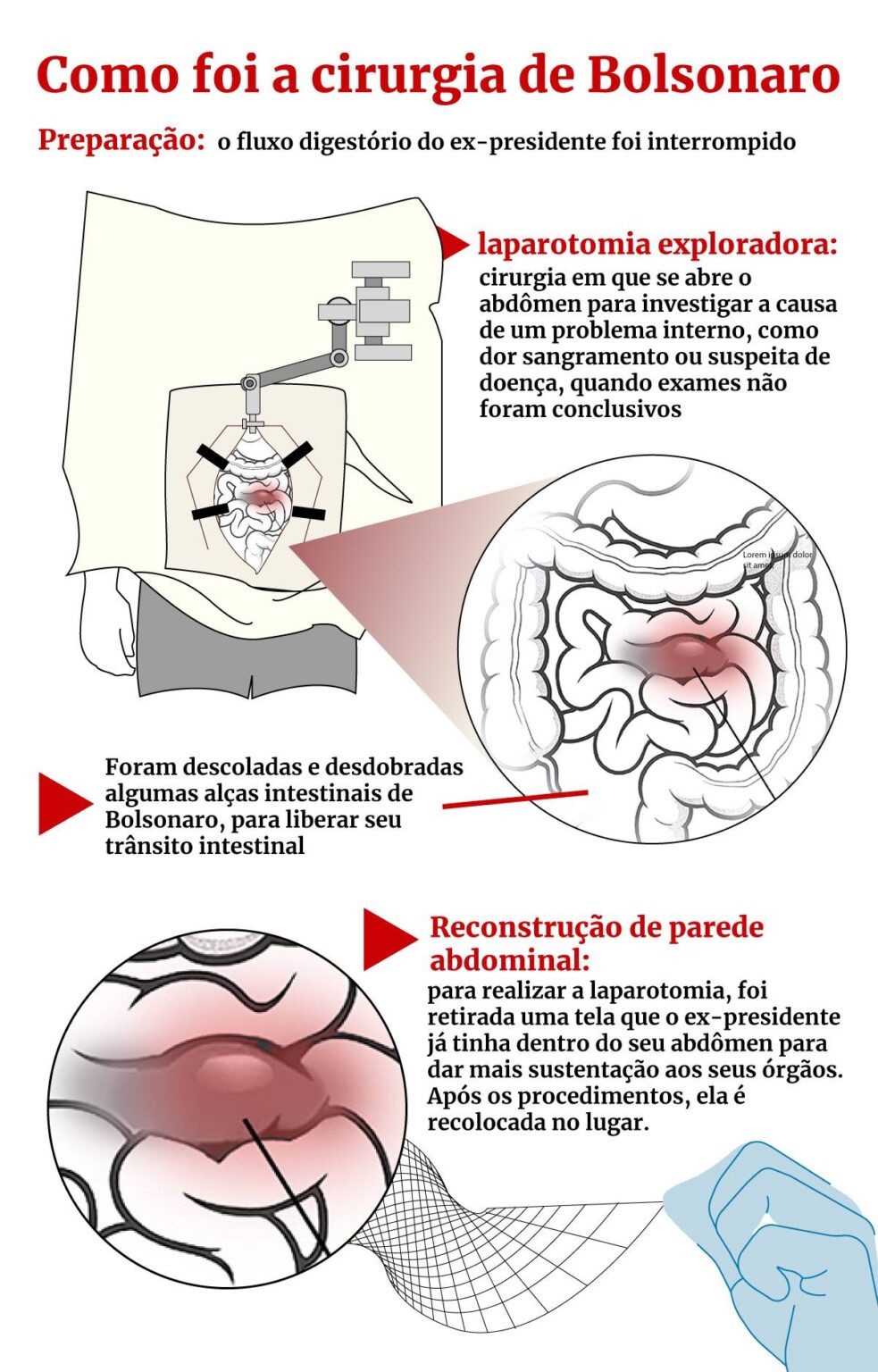Claudio Birolini também afirmou que a situação do ex-presidente é “complexa” devido à parede abdominal bastante “danificada”. Veja como foi a cirurgia: