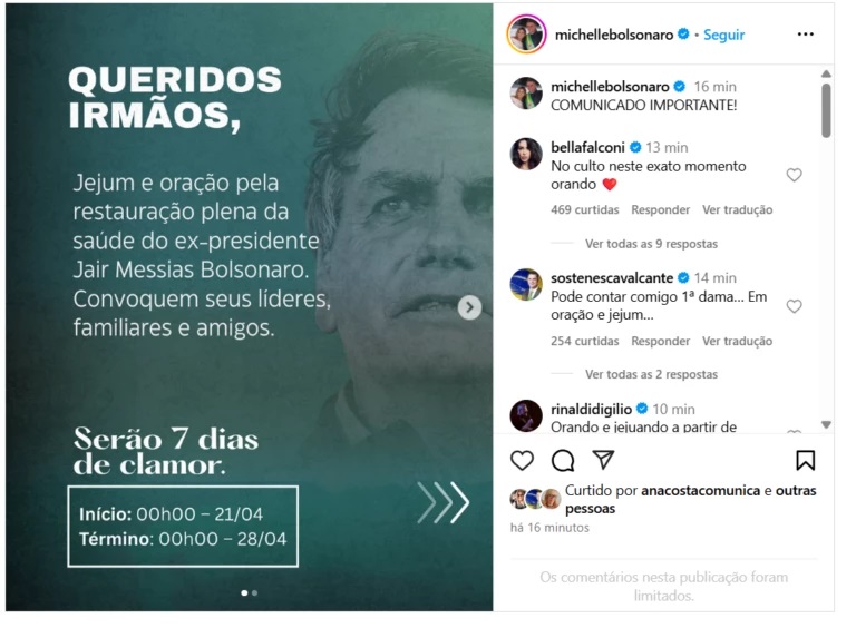– Jejum e oração pela restauração plena da saúde do ex-presidente Jair Messias Bolsonaro. Convoquem seus líderes, familiares e amigos.