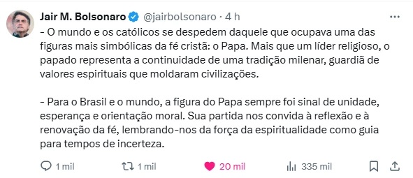 – Para o Brasil e o mundo, a figura do papa sempre foi sinal de unidade, esperança e orientação moral. Sua partida nos convida à reflexão e à renovação da fé, lembrando-nos da força da espiritualidade como guia para tempos de incerteza – finalizou Bolsonaro.