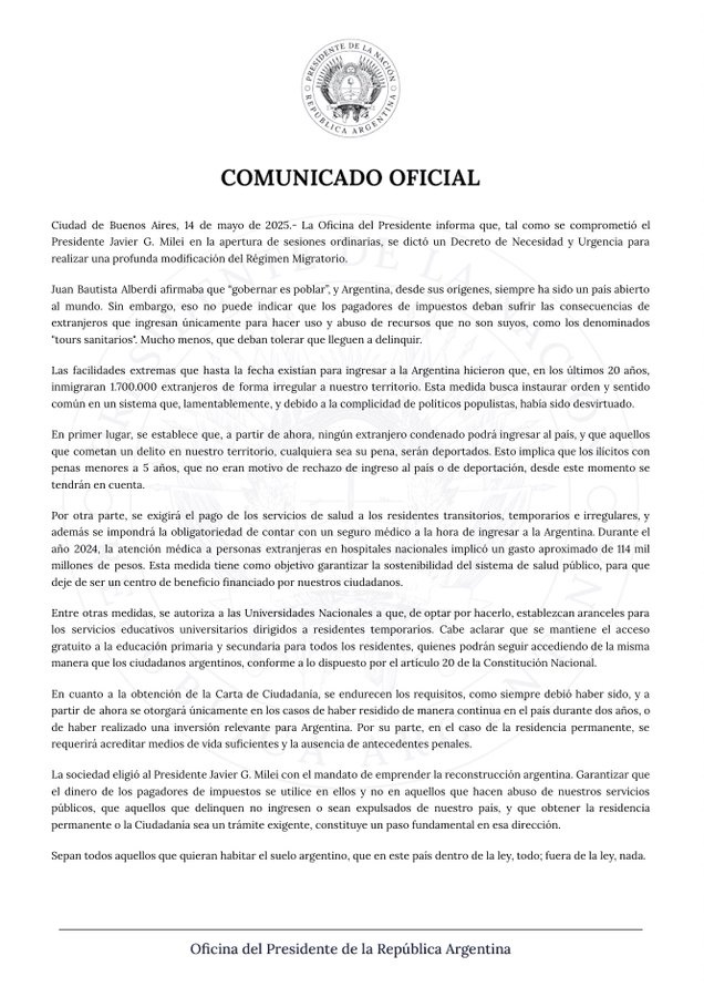“Garantir que o dinheiro dos contribuintes seja utilizado neles e não naqueles que abusam de nossos serviços públicos; que aqueles que cometem crimes não entrem ou sejam expulsos de nosso país; e que obter a residência permanente ou a Cidadania seja um trâmite exigente constitui um passo fundamental nessa direção”, finaliza o governo. “Saibam todos aqueles que desejam habitar em solo argentino que, neste país, dentro da lei, tudo; fora da lei, nada.”