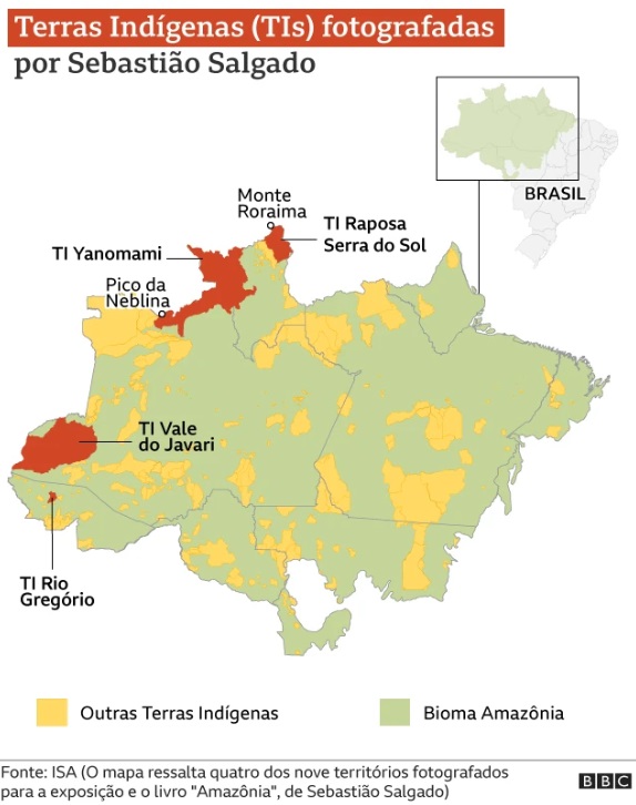 Por trás das belas imagens em preto e branco de montanhas, rios e da floresta amazônica — e dos retratos de 12 das 305 etnias indígenas presentes na região apenas no Brasil — Sebastião Salgado documentou histórias de garimpo ilegal, conflitos com madeireiros, garimpeiros e autoridades locais, mortes por falta de atendimento médico e episódios de perseguição.