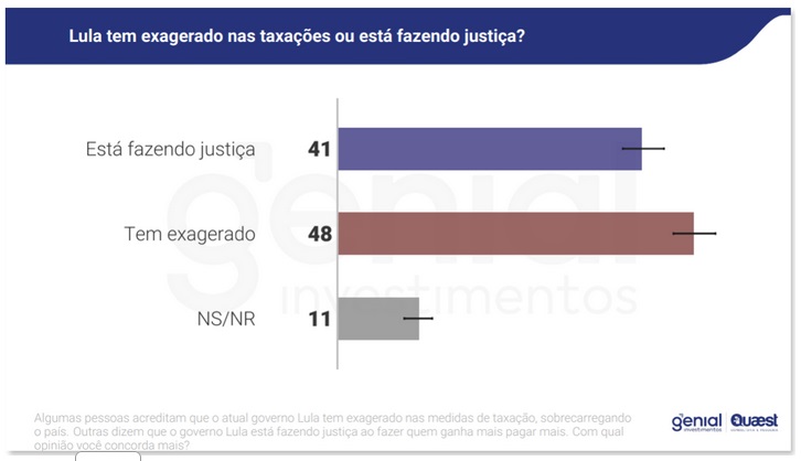 Por Redação, 10 de junho de 2025 - Uma pesquisa divulgada nesta terça-feira (10) pelo instituto Quaest revela que 48% dos brasileiros rejeitam as propostas tributárias apresentadas pelo governo do presidente Luiz Inácio Lula da Silva (PT). Por outro lado, 41% dos entrevistados disseram apoiar as medidas relacionadas à reforma tributária e à criação de novos impostos. O levantamento aponta ainda 11% de indecisos ou que preferiram não opinar.