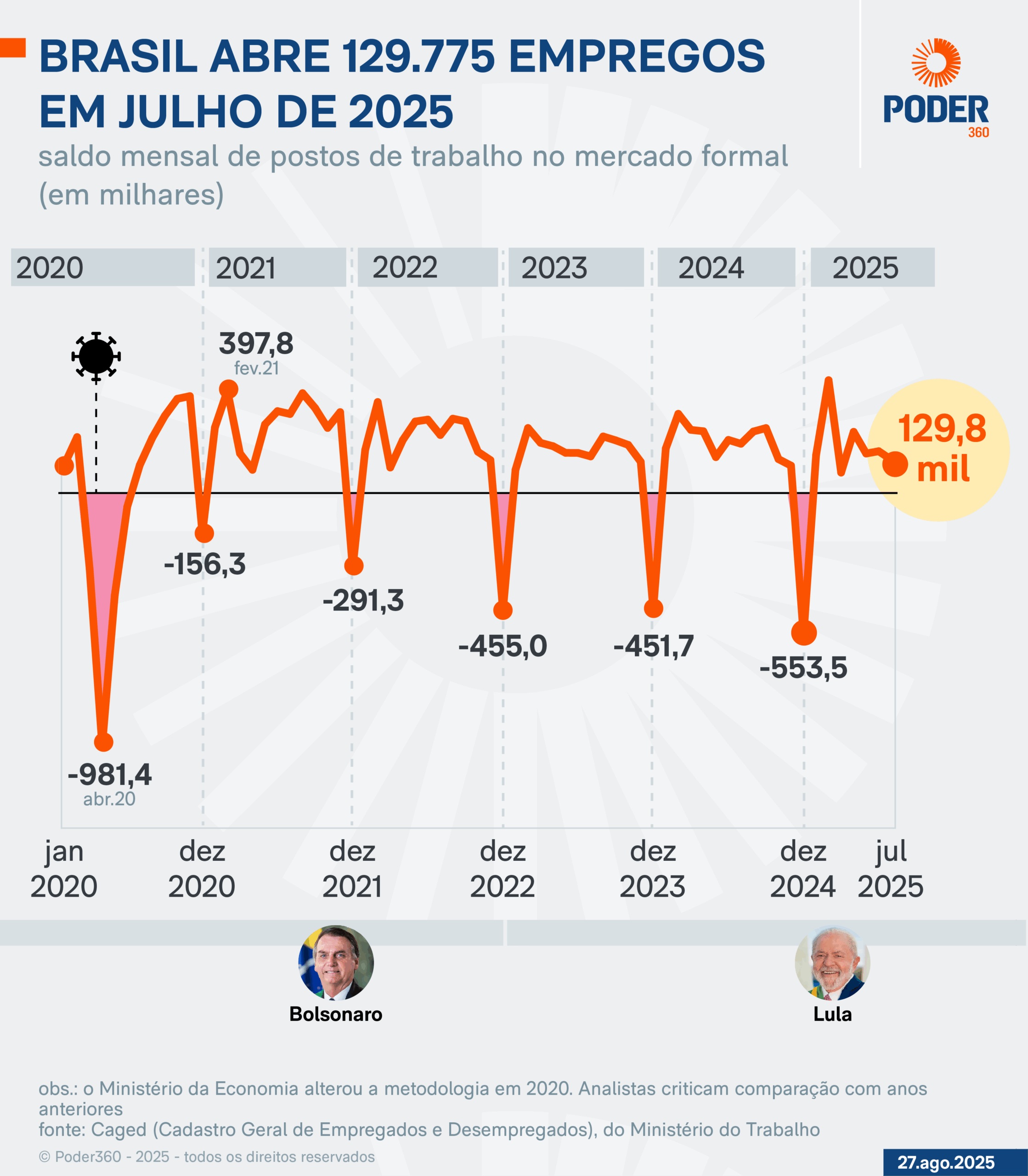 O Brasil criou 129.775 empregos com carteira assinada em julho de 2025. O número é 32,2% menor do que o registrado no mesmo mês de 2024, quando houve saldo positivo de 191.373 postos de trabalho. É o pior resultado para o mês desde 2020, quando foi de 108.476. Naquele período, havia uma pandemia de covid.
