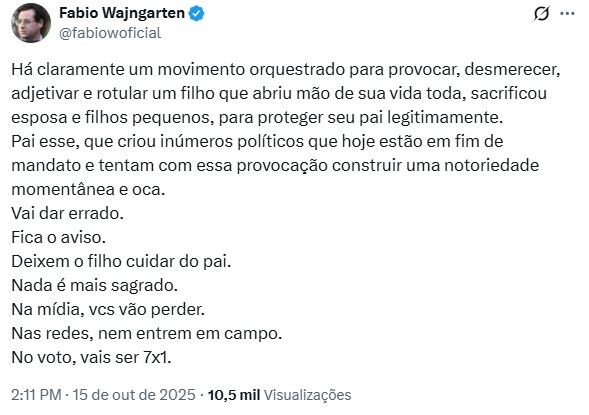 – Vai dar errado. Fica o aviso. Deixem o filho cuidar do pai. Nada é mais sagrado. Na mídia, vocês vão perder. Nas redes, nem entrem em campo. No voto, vais ser 7×1.