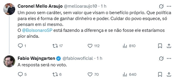 O vice-prefeito de São Paulo, coronel Mello Araújo (PL), aliado de Jair Bolsonaro, comentou na publicação. Ele criticou a falta de caráter por parte de muitos políticos, que só trabalham em virtude de seus próprios interesses, e elogiou a atuação de Eduardo Bolsonaro.