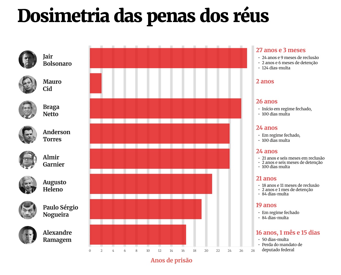 A análise dos embargos de declaração é mais um passo para que os condenados do chamado núcleo 1 cumpram suas penas. No caso de Bolsonaro, a condenação é de 27 anos e 3 meses.