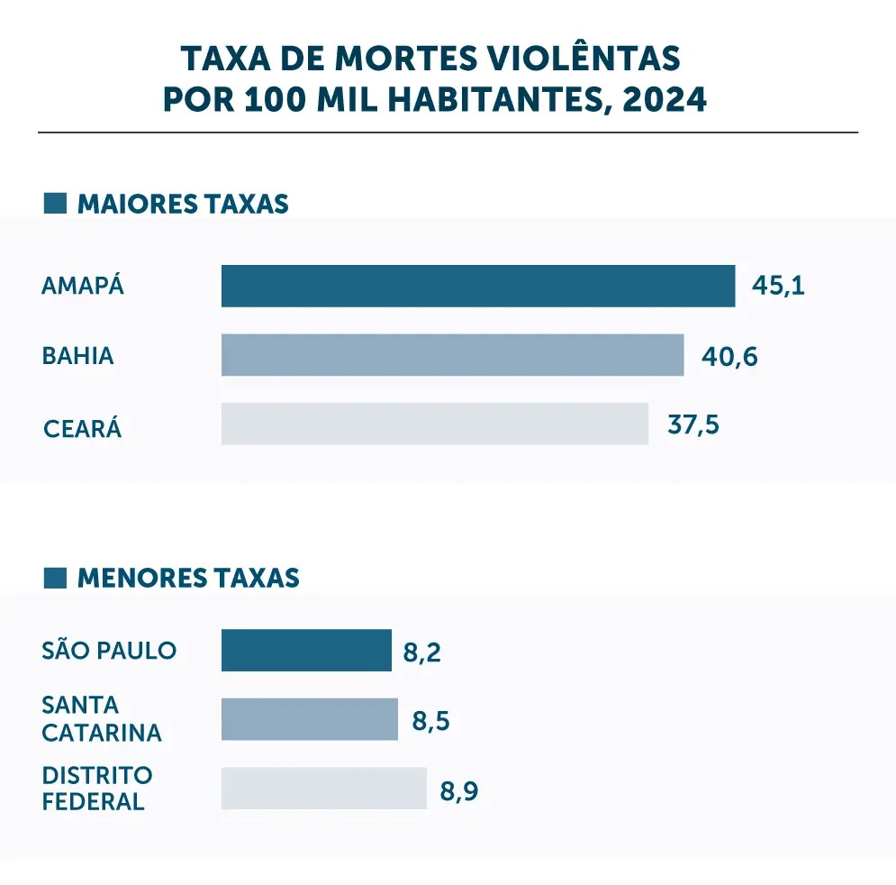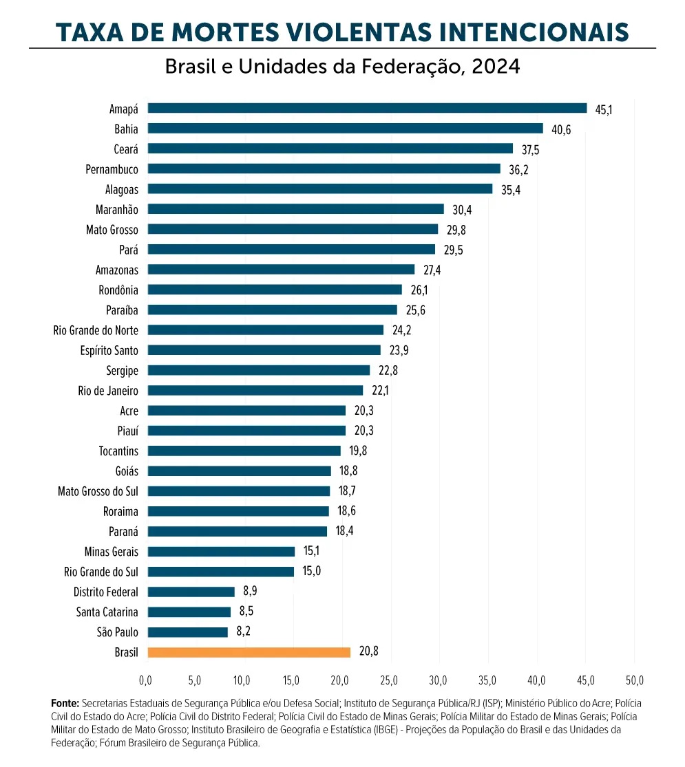 Segundo o Anuário Brasileiro de Segurança Pública, a Bahia é o segundo Estado mais violento do Brasil, atrás do Amapá. Ao menos cinco das dez cidades mais perigosas do país estão ali: