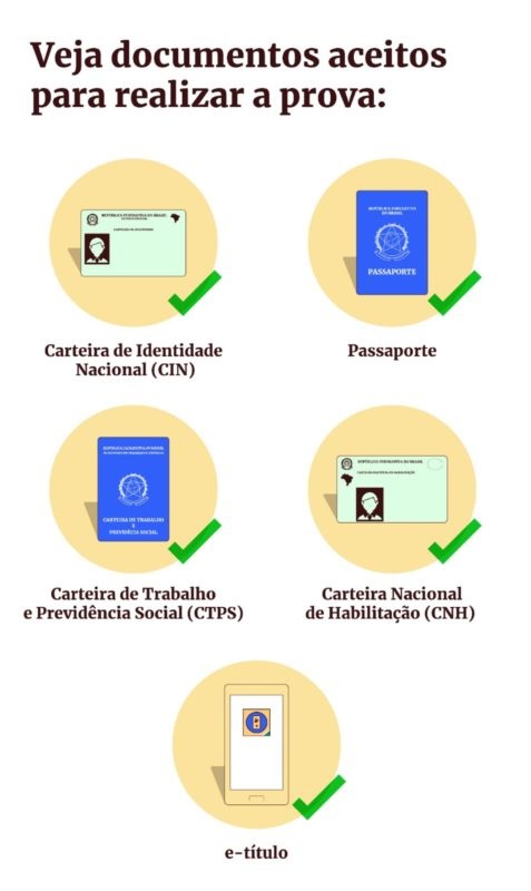 Para entrar na sala onde será aplicada a prova, o candidato deverá apresentar a via original de documento oficial de identificação com foto. Confira quais documentos são aceitos: