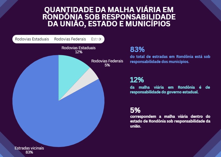 A malha viária de Rondônia revela um cenário de forte desigualdade na distribuição de responsabilidades entre os entes federativos. Enquanto a União e o Estado concentram rodovias pavimentadas e melhor estruturadas, os municípios assumem quase toda a extensão das estradas vicinais, justamente as mais frágeis, extensas e caras de manter.