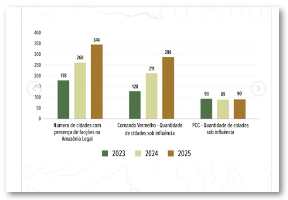 O relatório destaca a hegemonia do Comando Vermelho (CV) entre as facções atuantes na região. De acordo com a análise mais recente, dos 176 municípios com domínio de uma única facção, 130 são controlados pelo CV, seguidos pelo Primeiro Comando da Capital (PCC) em 28 deles.