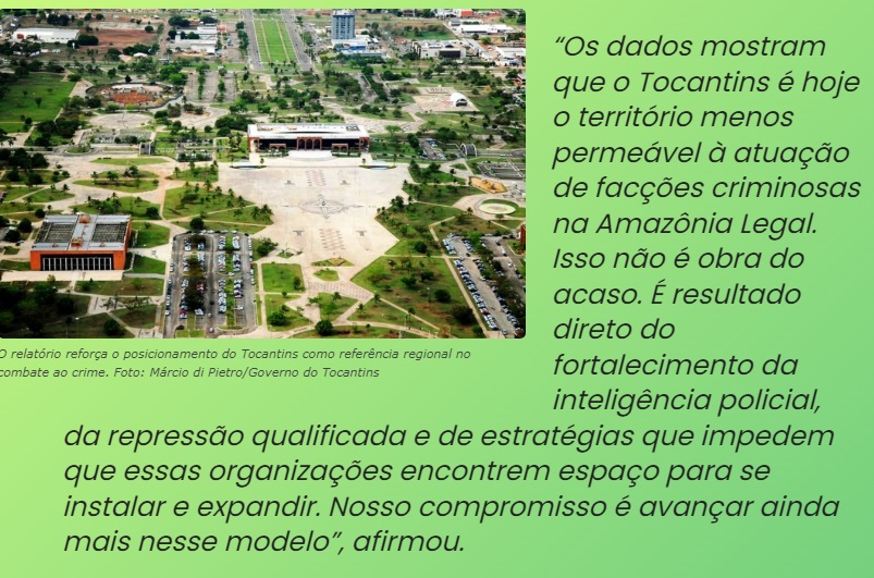 O relatório reforça o posicionamento do Tocantins como referência regional no combate ao crime organizado e na redução de indicadores de violência, evidenciando avanços obtidos a partir de ações integradas entre Secretaria de Segurança Pública e Polícia Civil.