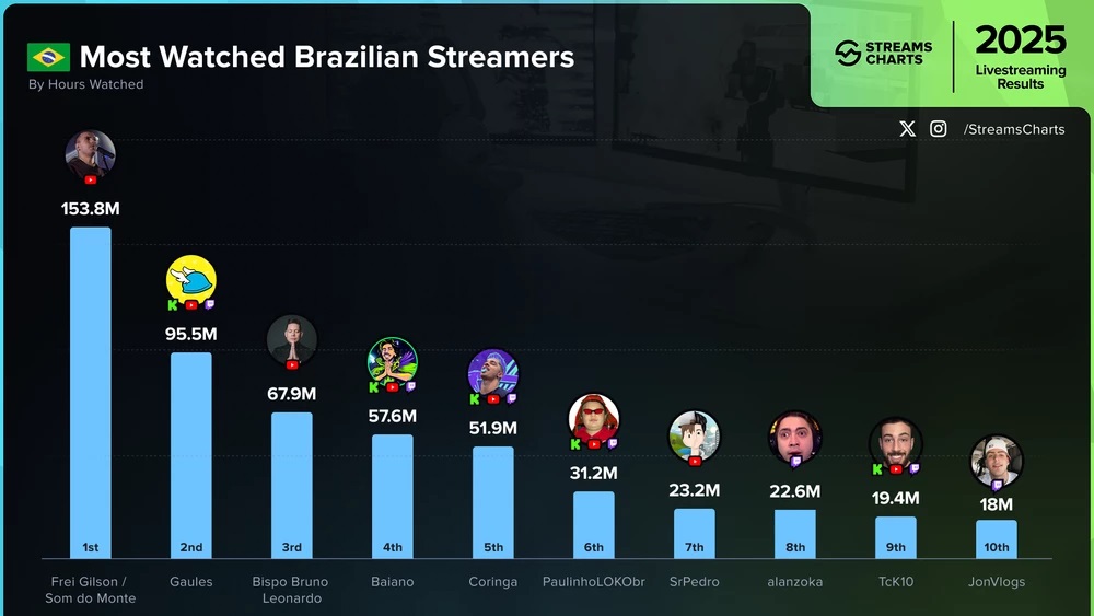 Na segunda colocação aparece Gaules, com 95,5 milhões de horas assistidas. Em terceiro lugar ficou o bispo Bruno Leonardo, que somou 67,9 milhões.