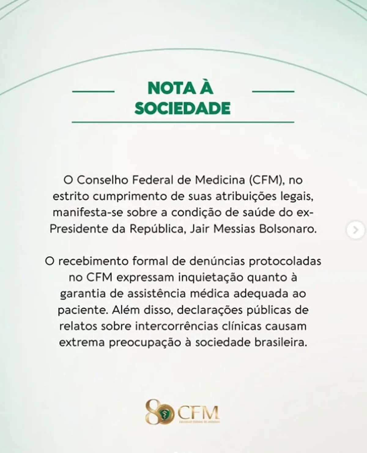 O CFM publicou, nesta quarta-feira (7/1), nota informando que determinou ao Conselho Regional de Medicina do Distrito Federal (CRM-DF) a instauração de sindicância para apuração da condução do caso em que o ex-presidente Jair Bolsonaro caiu e bateu a cabeça, na Superintendência da Polícia Federal, onde cumpre pena.