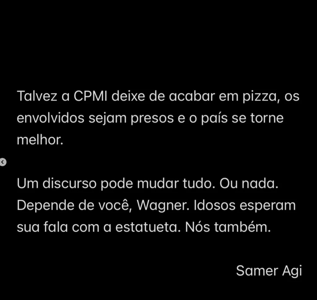 “O fato ainda não foi julgado”, afirma Agi, ao defender que um discurso com esse teor poderia “jogar luz sobre o tema” e pressionar as investigações. Ele sugere que a CPMI deixe de “acabar em pizza”, com eventual responsabilização dos envolvidos, e afirma que “um discurso pode mudar tudo. Ou nada”.