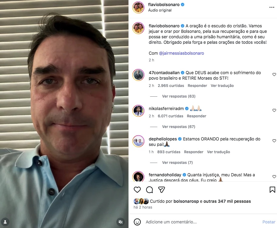 – A oração é o escudo do cristão. Vamos jejuar e orar por Bolsonaro, pela sua recuperação e para que possa ser conduzido a uma prisão humanitária, como é seu direito. Obrigado pela força e pelas orações de todos vocês – escreveu.