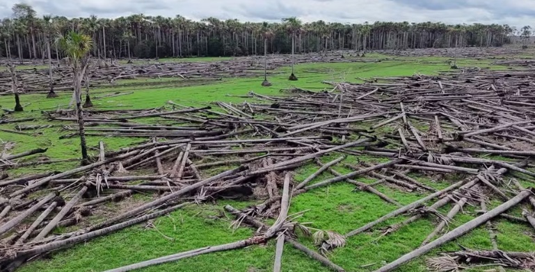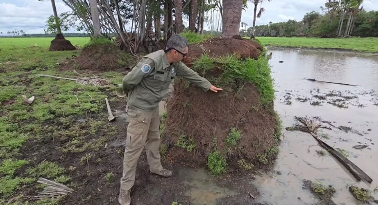 🌳 Os buritis, adaptados às áreas úmidas, perderam a capacidade de reter água devido à presença dos búfalos, que compactam o solo, abrem canais de drenagem e destroem as mudas, acelerando a seca e impedindo a regeneração da vegetação; como resultado desse processo de degradação, em 2024 ocorreu pela primeira vez um incêndio intenso o suficiente para queimar até o solo.