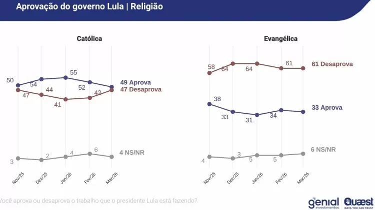 Aprovação de Lula entre católicos passou de 55%, em janeiro, para 49%, em março. O levantamento da Quaest mostrou também que a desaprovação subiu de 41% em janeiro para 47% neste mês. A margem de erro é de três pontos percentuais para mais ou para menos — ou seja, as duas variações ocorreram fora da margem. Em março, houve um empate técnico entre aprovação (49%) e desaprovação (47%).