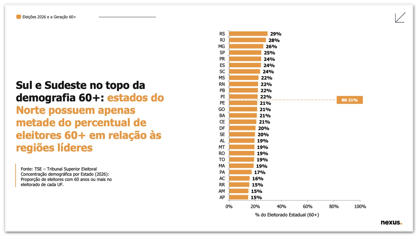 O Rio Grande do Sul lidera, com 29%, seguido por Rio de Janeiro (28%) e Minas Gerais (26%). São Paulo (25%) e Paraná (24%) completam o grupo com maior presença relativa. Nos três maiores colégios eleitorais do país, os eleitores com mais de 60 anos somam cerca de 16 milhões de pessoas.