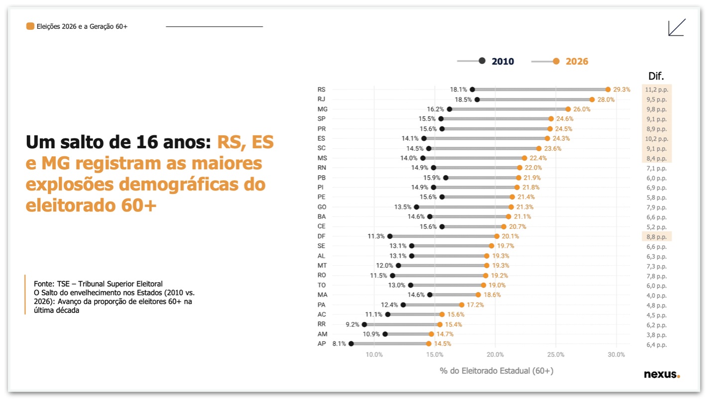 A partir dessas informações, a Nexus construiu séries históricas, projeções e comparativos regionais para analisar o avanço da participação da geração 60+ no eleitorado brasileiro.