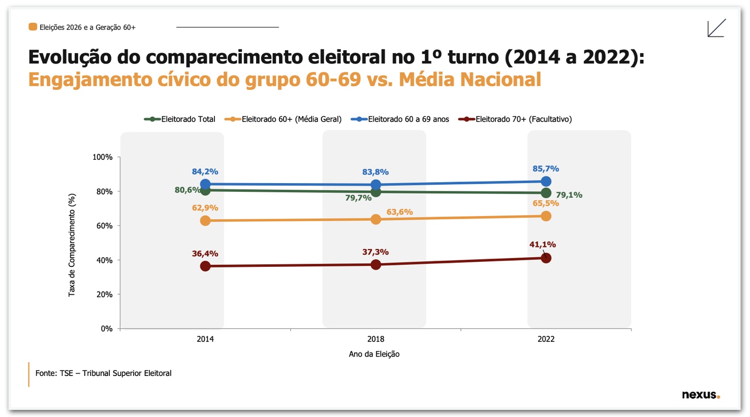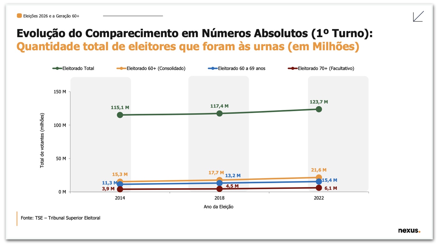 Em números absolutos, o engajamento da Geração 60+ vem crescendo: 15,3 milhões votaram em 2014, 17,7 milhões em 2018 e 21,6 milhões em 2022.