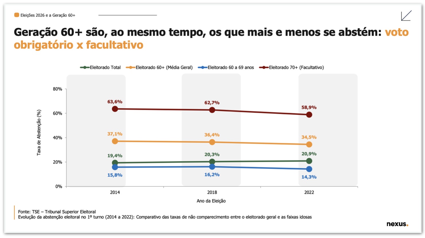 O comportamento eleitoral varia dentro da própria Geração 60+. Entre os eleitores de 60 a 69 anos, para os quais o voto ainda é obrigatório, a taxa de comparecimento é superior à média nacional. Em 2022, 85,7% foram às urnas, contra 79,1% do eleitorado total.