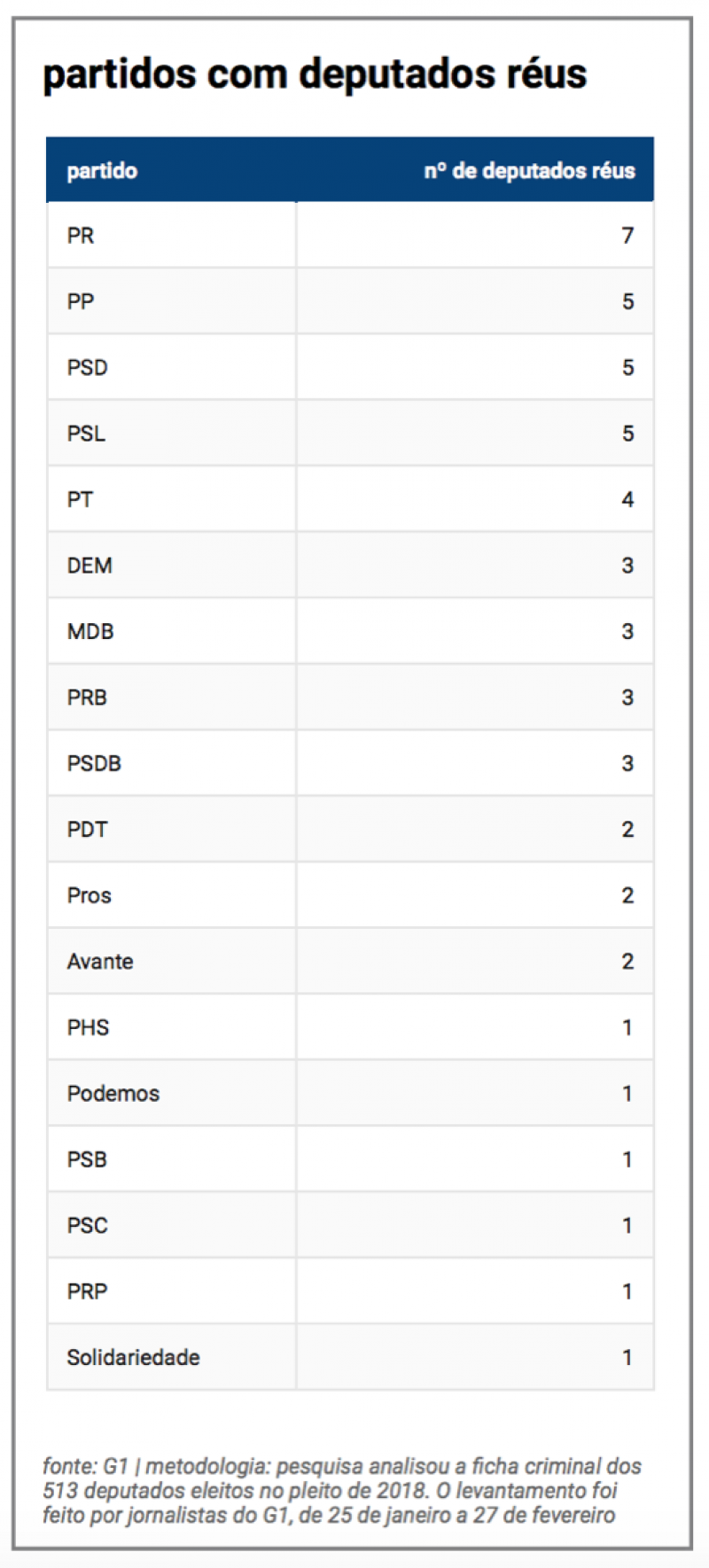 O PR é o partido que tem mais deputados respondendo ações, ao todo 7 congressistas são réus. Em seguida aparecem o PP, o PSD e o PSL, cada 1 com 5 acusados. Eis a lista dos partidos envolvidos: