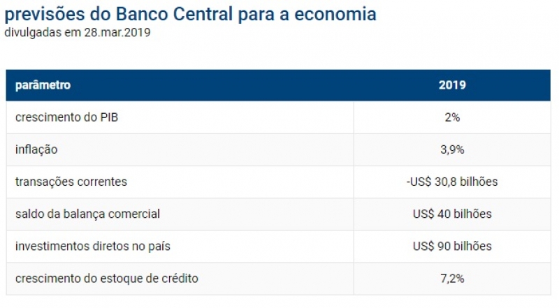 O BC (Banco Central) revisou sua expectativa de crescimento do PIB (Produto Interno Bruto) brasileiro em 2019. A autoridade monetária espera que a economia cresça 2% neste ano. Em dezembro do ano passado, projetava alta de 2,4%.