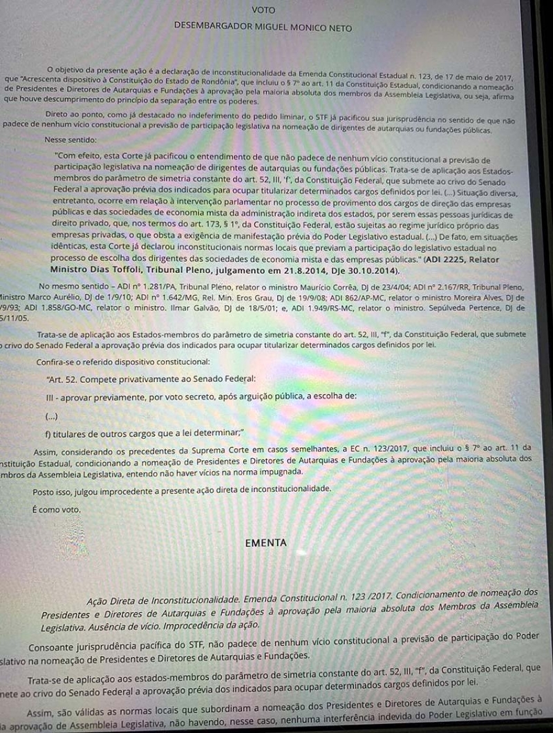 De acordo com o acórdão (decisão) sobre o julgamento da Ação Direta de Inconstitucionalidade do Governo, “são válidas as normais locais que subordinam a nomeação de presidentes e diretores de autarquias e fundações à prévia aprovação da Assembleia Legislativa de Rondônia, não havendo nenhuma interferência indevida do Legislativo em função típica do Executivo, nem violação ao princípio da separação de poderes”. Esta decisão foi tomada em 16de abril do ano passado.